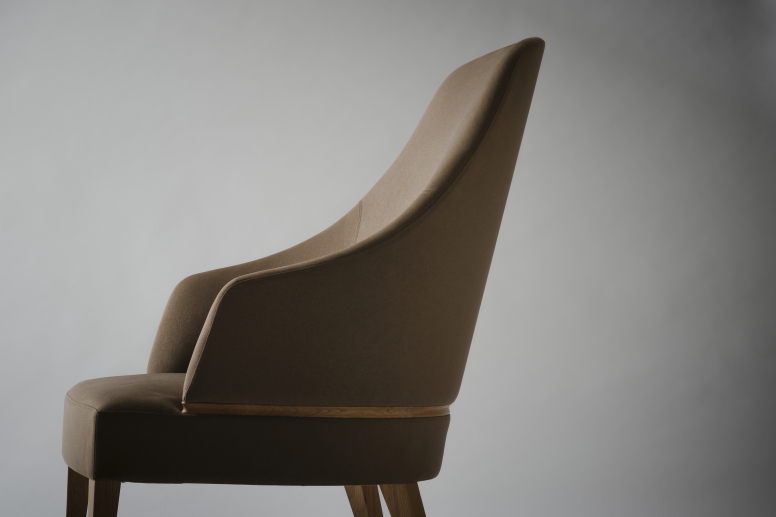 素材感の違いにより視覚的に分離しがちな張込みのシェル部分とウッドフレームは、ゆるやかな曲線のシートバックと張込みのアームを肘掛の下まで伸ばし一体感を持たせながら体を包み込むフォルムにデザインしました。背面のシートバックと後部貫フレームの接点をシェル形状に添うように細かな曲面加工を施すことにより、感覚的な調和が生まれています。