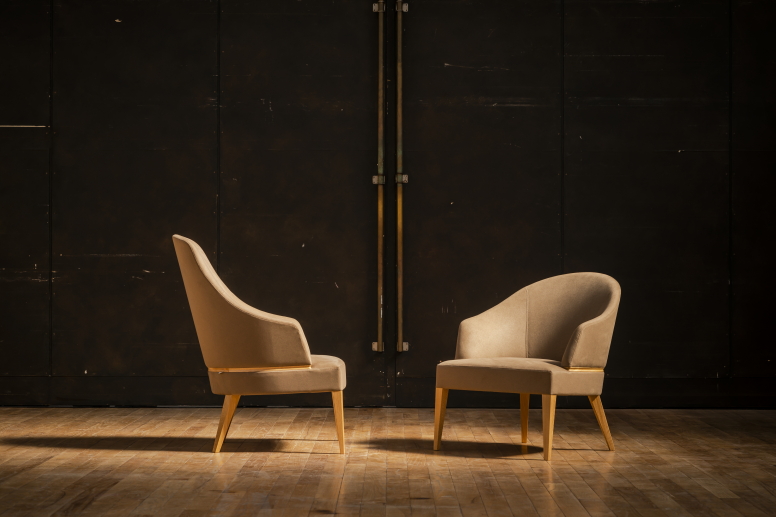 チェアのウエスト部分に象徴的なアクセントウッドを加えることにより、シートと背のシェルを分離し各パーツでの製作と張込み作業が容易になっています。結果的に従来あるような一体的に張込むラウンジチェアとは違い、作業的な工程を簡素化しつつ完成度を上げることにつながっています。