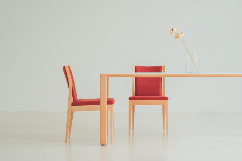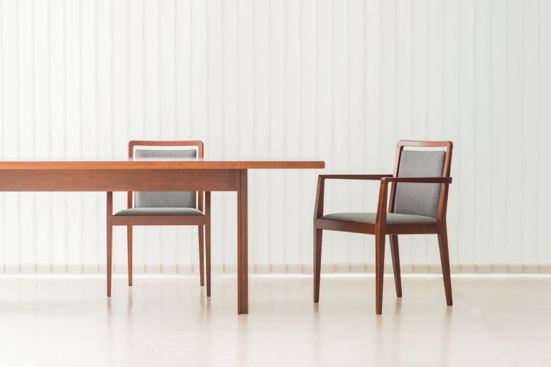 無垢材の木口を削り込むことで見た目の薄さを強調し脚部に流れるラインを軽快な印象のディテールに仕上げました。