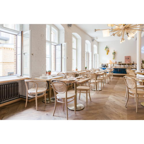 創業者ミヒャエル・ト―ネットが蒸気で木を曲げる技術を確立したことにより、初めて大量生産された椅子214に背もたれをつけて座りやすくしたデザインです。