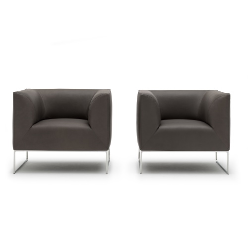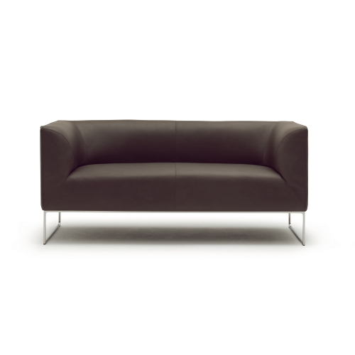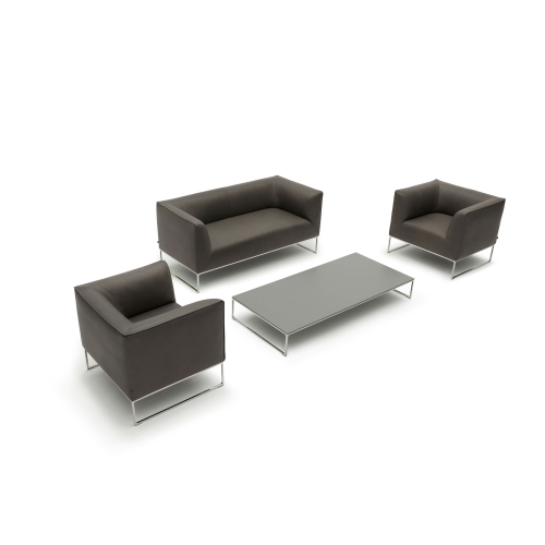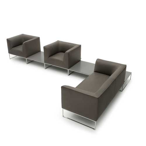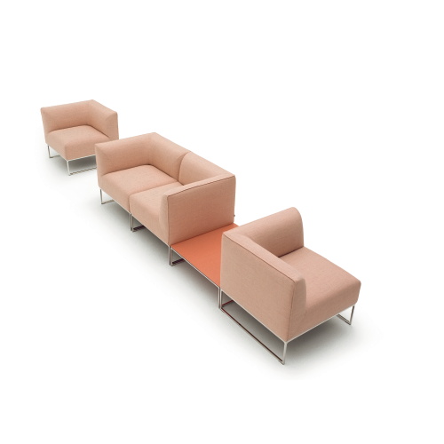 外側は平面とシャープなエッジ、内側は丸く優しい曲面、そして宙に浮いているかのように軽やかで繊細な脚部。ミニマルなディテールながら考え抜かれた絶妙なバランスで、均衡が保たれているデザインです。他に2人掛、コーナーエレメント、スツール等のエレメントがあり様々な組合せが可能となります。
