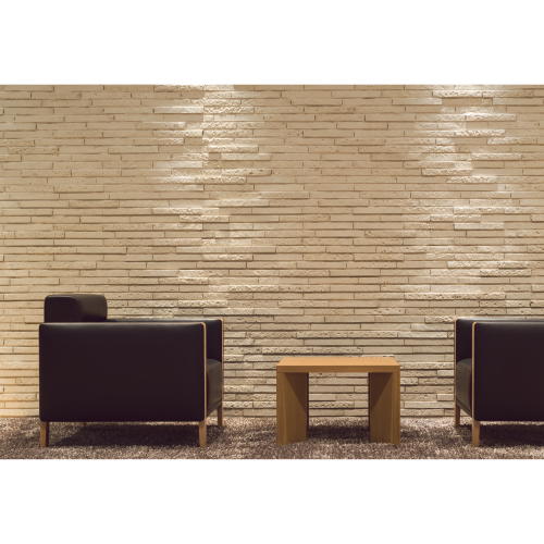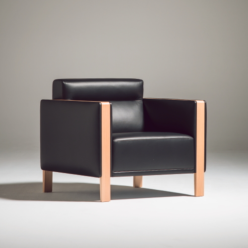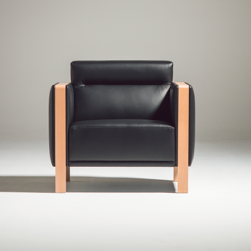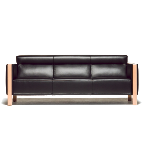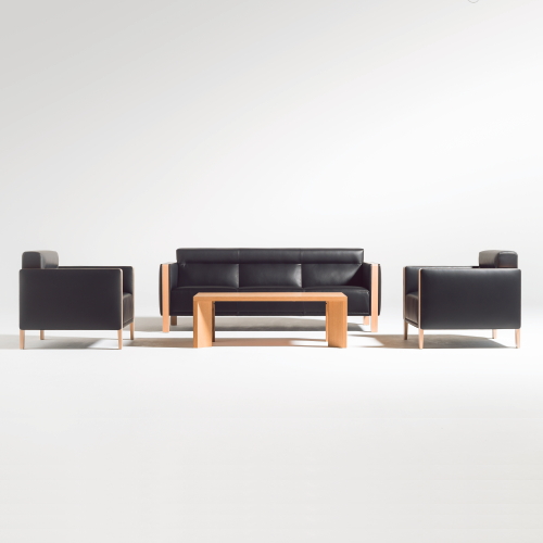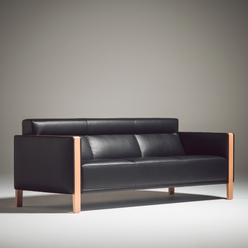 ファブリックの穏やかなふくらみとシャープで立体的なプロポーションのバランスが木の質感を際立たせているアームレスト。直線的なシルエットが特徴のソファです。
