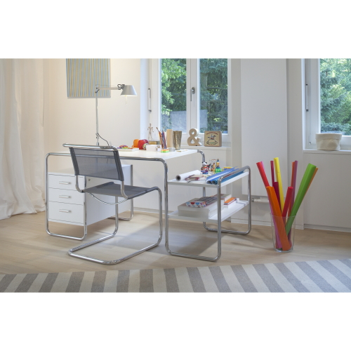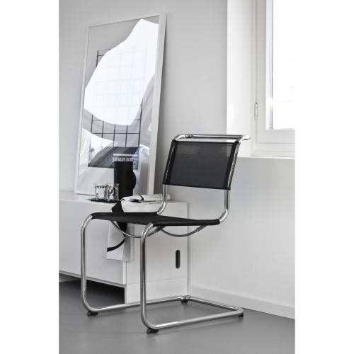 「雲の上の座り心地」と言われ座面の片側だけで座面を支えるカンティレバーチェア。(片持ち式構造)座面のシートは座った時の重みで沈み、身体にかかる圧の負荷は分散され、まるで空中に座っているかのような独特の浮遊感を感じます。