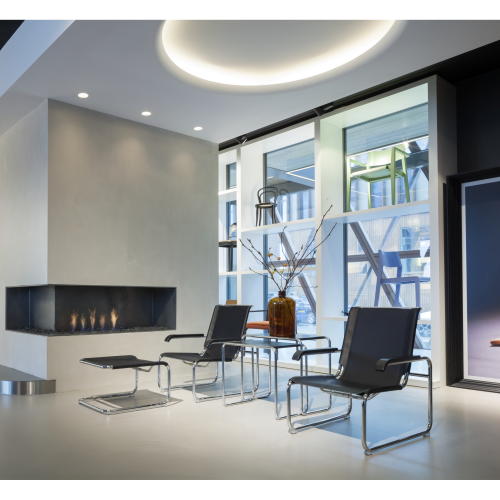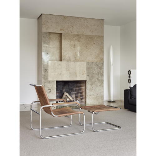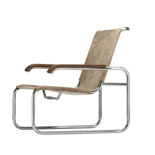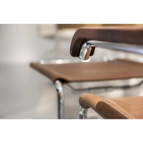 S35 はバウハウス時代のカンティレバーチェアの中でも、軽さ、柔軟性、快適性を兼ね備えたアームチェアです。1 本の連続したフレームがすべての機能を統合することに成功しており、座から独立してアームまで伸びるフレームは二重のカンティレバー構造となっています。そのため、柔らかな座り心地と快適なリクライニング性能が実現されました。
